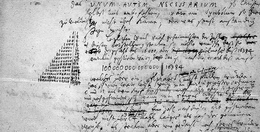 Gottfried Wilhelm Leibniz, had already explained in May 1696 the idea of a dual system, which consists only of the numbers 0 and 1. In January 1697, he described this connection between mathematical structures and the theological-philosophical interpretation of the world in written form in his letter to Duke Rudolph August, which is known today as the “New Year’s Letter”. Here, Leibniz interpreted his dual number system in terms of creation: from nothing (i.e. zero) and God’s word (i.e. one), the entire world had come into being. On the left edge of the letter page, the binary code developed by Leibniz can be seen in the form of a number pyramid.