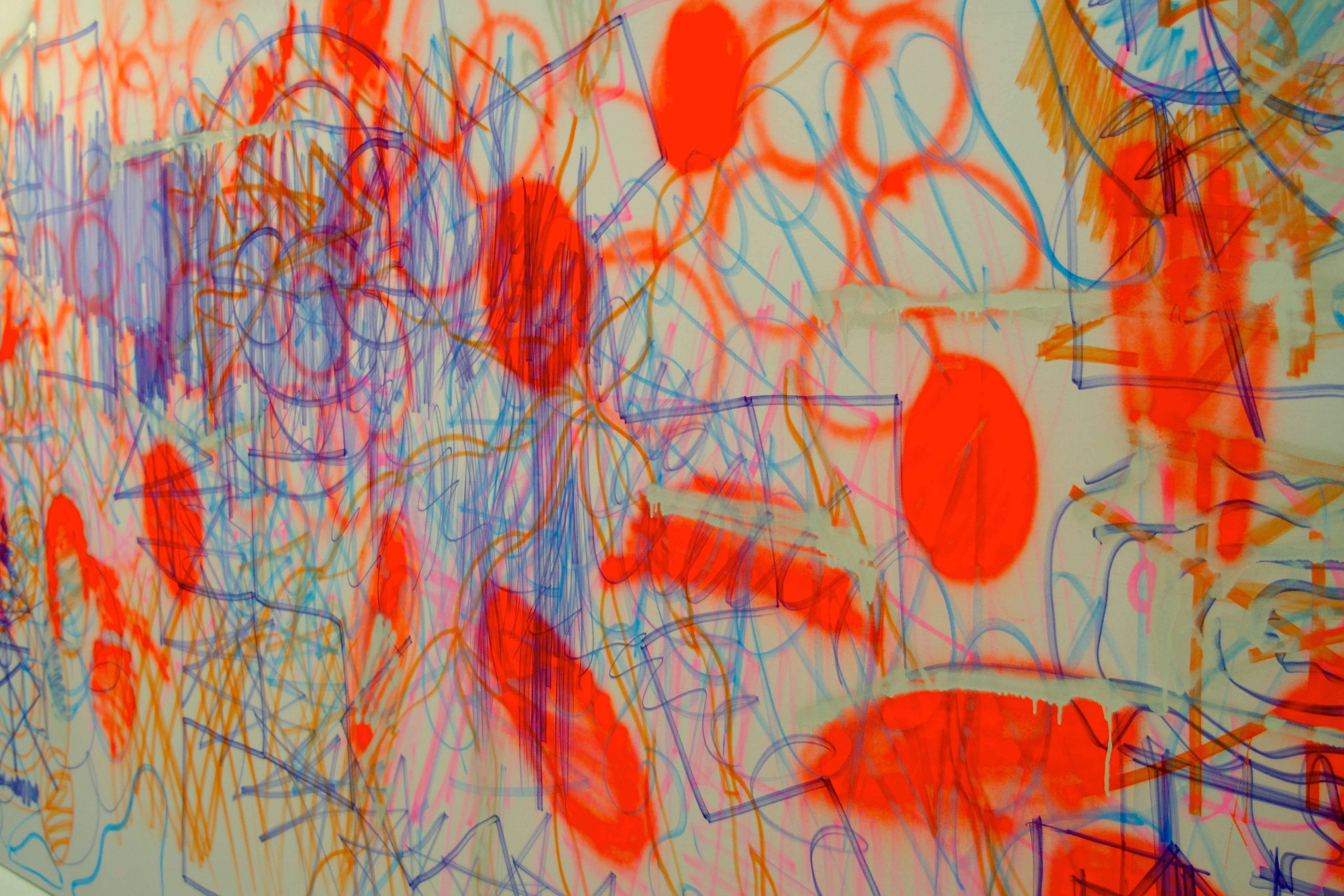 A painting is complete when everyone is satisfied with the result. We have compositions, which are kinds of traffic regulations to avoid accidents, but everyone is allowed to break the law for the love of the completed painting. You run a red light when you have to catch a bus. There are no standard recipes for finding an end when painting. Sometimes the entry from Veronika, Daniel, or Thomas sits so that none of us wants to keep painting. Sometimes we stop because the composition is over. Sometimes we stop because we have reached a monochrome surface. In Lothringer 13, we responded directly not only to what was happening on the surface, but also to Alina’s movement, Kokayi’s singing, and Steve’s music. All of this determines when the painting is complete.